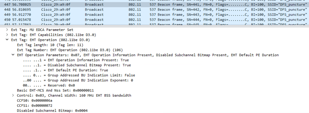 In legacy Wireless, detection of radar signal on AP radios serving channels would need channel switch or reduction in channel width. 802.11be introduces DFS puncturing feature wherein AP and client station can continue to leverage existing channel width except for the subchannel on which radar is detected.