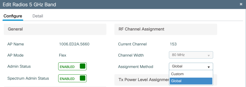 Configuration>Wireless>Access Points>Edit Radios(6G/5G/2.4G)>RF Channel Assignment> Assignment Method> Global