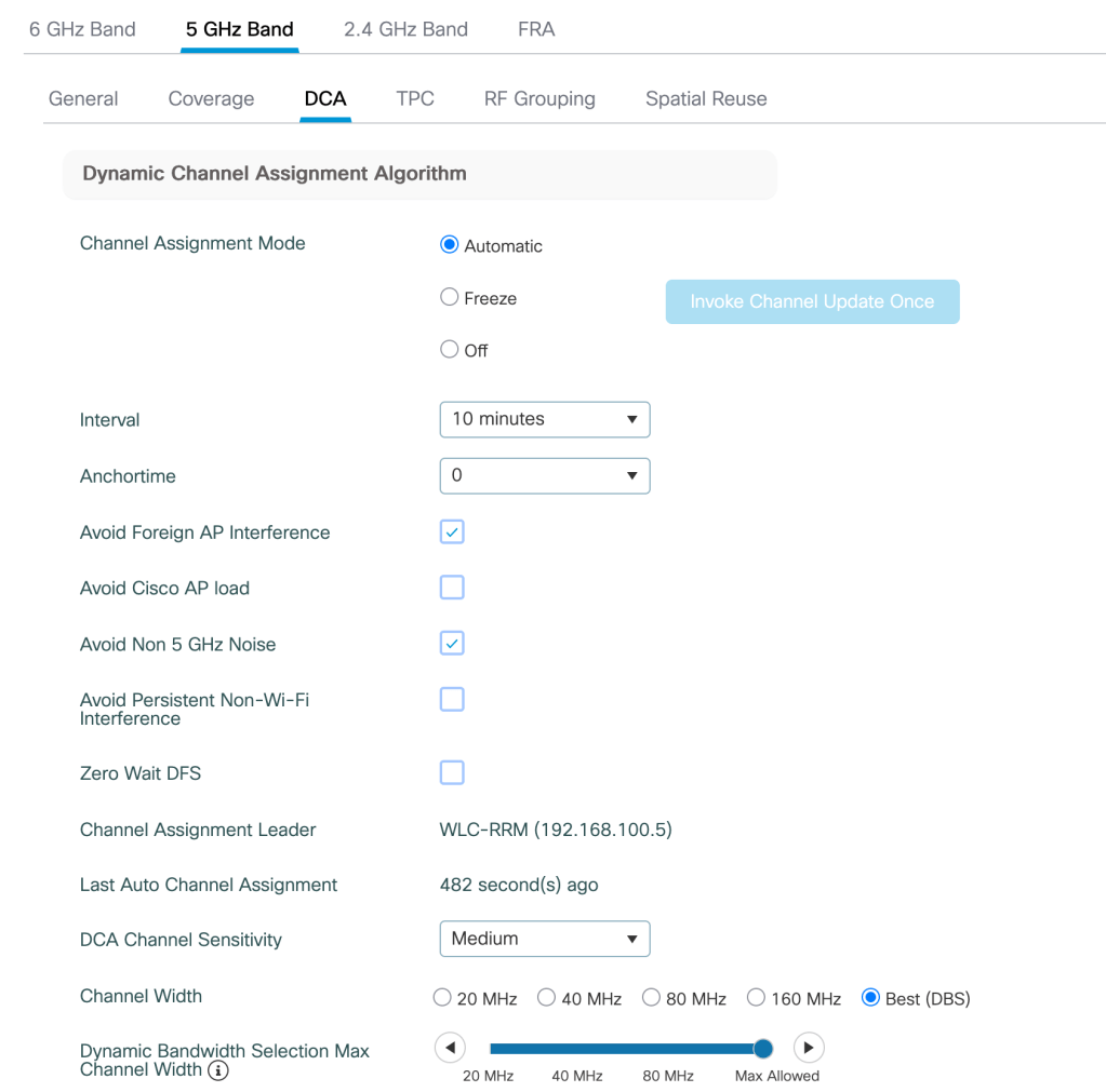 Configuration>RRM>5 GHz Band> DCA>Channel width>Best (DBS)