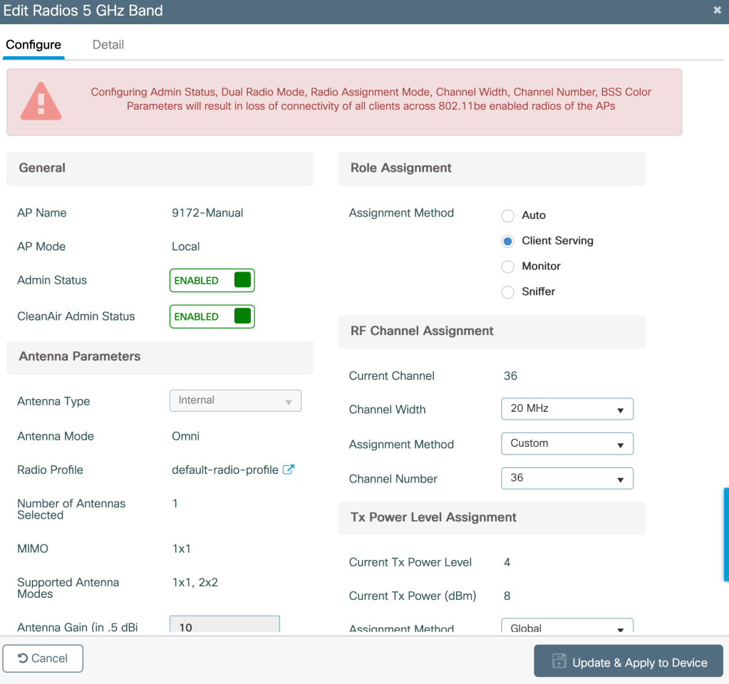 Static Channel Assignment– Manually assign non DFS channels on the 5 GHz radio statically. Cisco AP needs to be configured in Client Serving mode to assign a static channel- Configuration>Access Points>5 GHz radios>AP>Role assignment>Client serving (shown below)