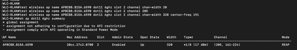 In 9800 WLC, you might have observed that although 6 GHz band in US domain supports 320 MHz until channel 221 there is no option to configure this from the WLC webGUI. The last channel that the webGUI will allow us to set for 320 MHz is 189.