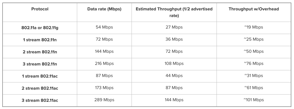 The table below shows the throughput chart based on client device capability.