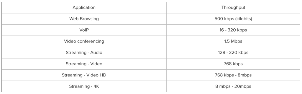 Throughput Planning: This method accounts for determining the AP count based on the aggregate throughput requirement in the RF environment. The throughput requirement for each type of traffic varies significantly. The below table shows the throughput requirement based on the type of traffic.