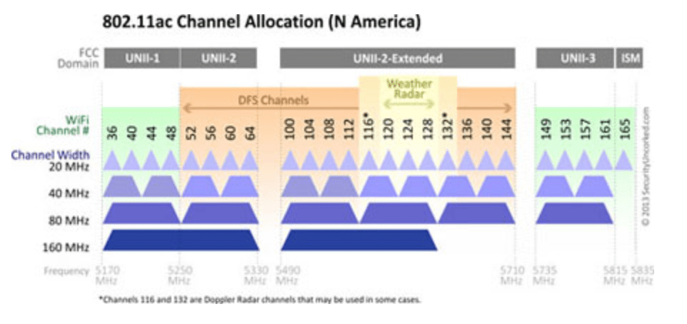 The 802.11 standard defines 23 20MHz wide channels in the 5 GHz spectrum. Each channel is spaced 20MHz apart and separated into three Unlicensed National Information Infrastructure (UNII) bands. In the United States, UNII-1 (5.150 to 5.250 GHz) containing channels 36, 40, 44, and 48 and UNII-3 (5.725-5.825) containing channels 149, 153, 157, 161 are permitted. UNII-2 (5.250-5.350 GHz and 5.470-5.725 GHz) which contains channels 52, 56, 60, 64, 100, 104, 108, 112, 116, 120, 124, 128, 132, 136, and 140 are permitted in the United States, but shared with radar systems. We can either configure the APs not to use the DFS channels, if the AP is broadcasting on DFS channel and if it detects a radar signal it has to switch to a new channel. I will explain the operation of DFS in a separate article. The following image shows 5 GHz channels-